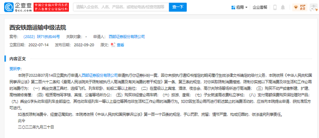 9月28日消息,企查查APP显示,近日,贾跃亭又被列入“老赖”名单,因未按执行通知书指定的期间履行生效法律文书确定的给付义务,其被西安铁路运输中级法院采取限制高消费措施,申请人为西部证券。