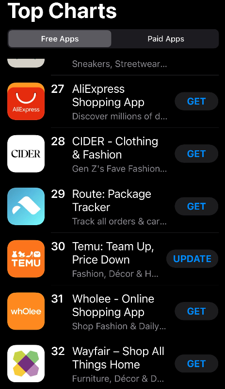 Temu的下载量正在快速上升,截止美东时间9月22日,Temu在App Store的Shopping类别下排30名,超过美国最大的在线家具商城Wayfair和Lululemon。在Google Play商店,Temu更是短暂登顶购物类目第一位。