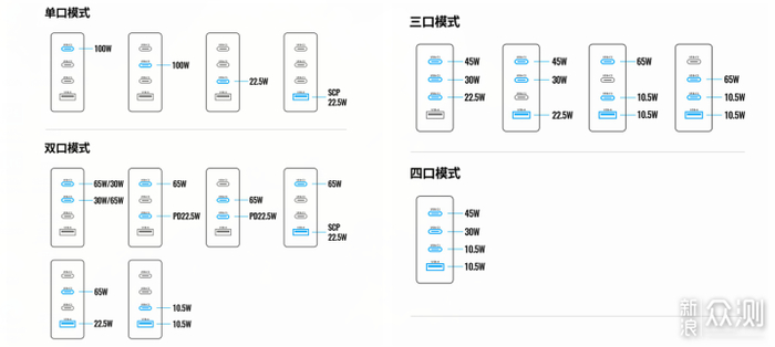在使用不同充电口的时候,功率分配如下。