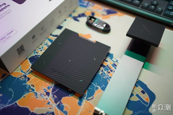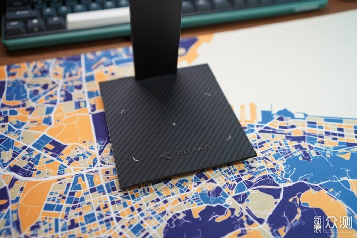 而底座可不仅仅是底座,还是一个无线充电区域,最高支持15W无线充电,表面则采用了PITAKA标志性的凯夫拉材质,具有强度高、耐高温的特点,纵横交错的纹理不仅美观,而且耐磨。