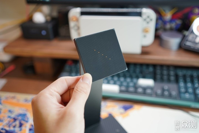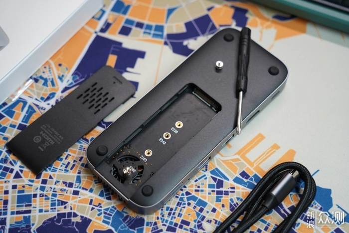 背面的盖子滑开是一个支持NVMe和SATA双协议的M.2接口SSD插槽,拓展坞秒变移动硬盘,它的体积也非常小巧,出门的时候可以将其轻松放入夹层口袋,也不用额外再带一堆数码配件和线材,非常方便。