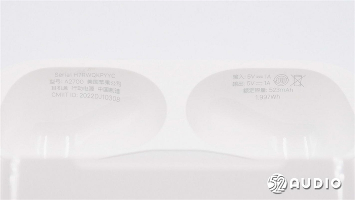 充电盒上盖内部文字信息:序列号:H7RWQKPYYC,型号:A2700,美国苹果公司,耳机盒,行动电源,中国制造;无线电发射设备型号核准代码:2022DJ10308;输入:5V?1A,输出:5V?1A(与前代保持一致);额定容量:523mAh/1.997Wh。