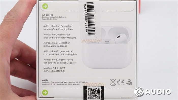 包装背面为充电盒打开的效果图,左右耳机卧于充电座仓;左下角有用6国文字印刷的配备无线充电盒的AirPods Pro 2。右下角有不可随意丢弃标志、CE安全认证标志,可循环利用标志,及英文印刷的苹果公司地址及电话网址信息。