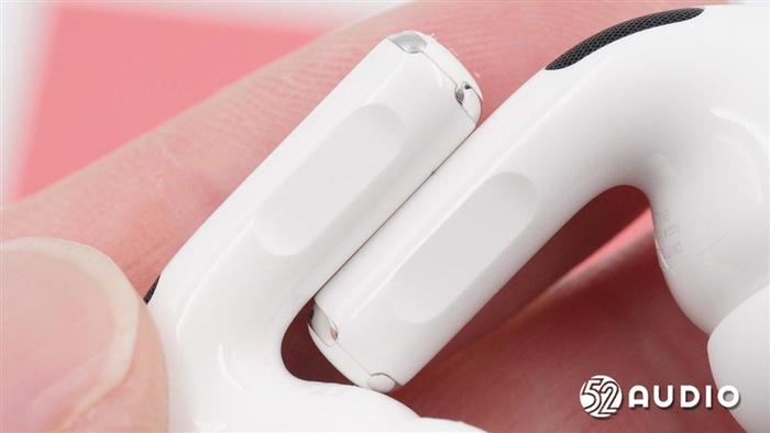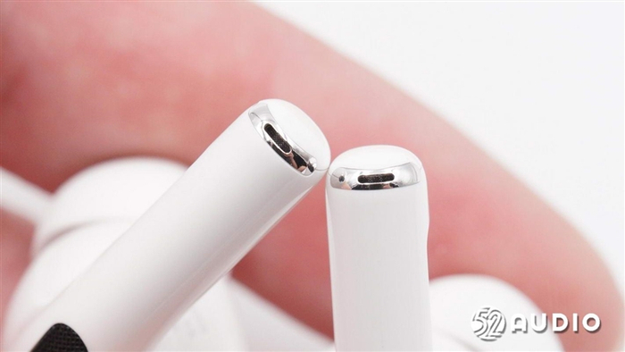 耳机底部的触控条展示(苹果新增的触控操作能够实现前代压感的操作功能)。