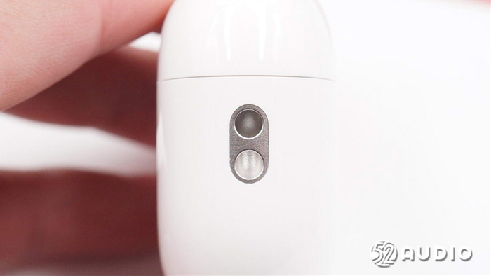 充电盒背面特写,AirPods Pro 2的铝材质金属合页主体横跨充电盒上盖与下部,合页下方有一颗配对按键,实测通过iPhone界面操作就可以实现配对,并不需要按下配对按键。这颗按键可以用来与安卓设备配对。