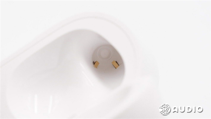 充电盒耳机座仓底部的充电金属弹片特写。