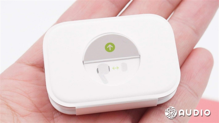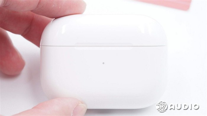充电盒正面特写,无线充电盒正面布局沿袭前代,中部有一颗充电指示灯。配对状态白灯闪烁,充电状态短暂显示红灯后熄灭,充电盒开盖显示及配对成功显示绿灯。