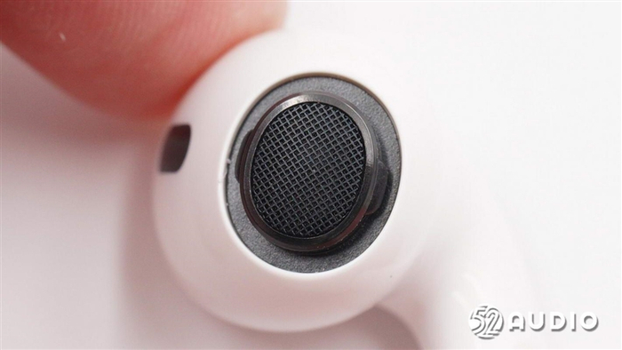 充电盒底部新增的扬声器开孔特写,细密防尘网防止异物进入(扬声器可用于搭配 Find My功能发出声响,便于用户快速找到丢失的耳机以及低电量模式警示)。
