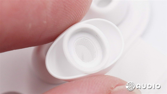 耳机出音口特写,出音口呈椭圆形,开口面积较大,有防尘罩覆盖,开口边缘是固定硅胶耳塞的凸起结构。