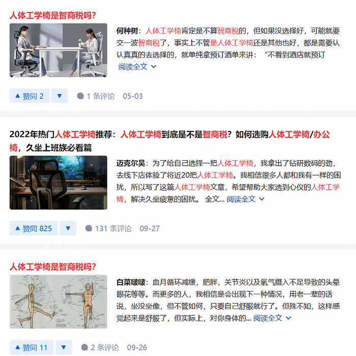 而伴随着上述企业的入局,流量端,关于人体工学椅相关的话题也在逐步累积,今天,打开社交媒体,输入“人体工学椅是智商税吗?”,99%的回答都会告诉你“不是,你只是没有买到适合你的那一款”,并附上购买链接。