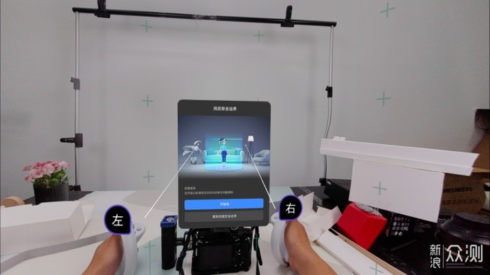 初次开机将提示设置安全区范围,有3种预设范围大小和自定义区域可供选择。当操作中身体接近安全区,眼前会提示网格,播放摄像头拍摄的实景,保护使用者安全。PICO 4 的前置摄像头采用1600万像素索尼彩色摄像头,因此展现出全彩透视的现实世界,相信在不久将来还能利用其实现MR功能。