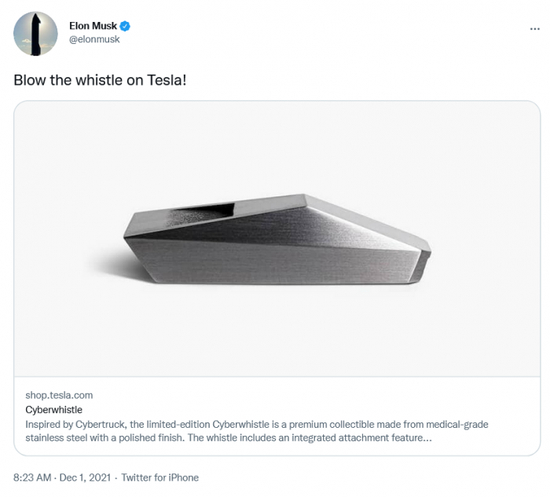 2021年12月,特斯拉推出限量版赛博卡车造型哨子(Cyberwhistle),售价每只50美元。Cyberwhistle的设计灵感来自公司的电动皮卡Cybertruck,将限量销售。特斯拉称,Cyberwhistle是一款优质收藏品,由医疗级不锈钢制成,表面进行了抛光。该哨子包括一个集成的附件功能,以增加它的多功能性。