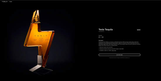 2021年3月25日,特斯拉中国官网上架了Tesla玻璃酒瓶,预售价779元,上架2天全部售磬。Tesla玻璃酒瓶是以Tesla龙舌兰酒为灵感而设计,酒瓶外形酷似闪电,经人工吹制而成。饰有金色 Tesla 字标和 T 型标志,容量750毫升,并搭配抛光金属支架。