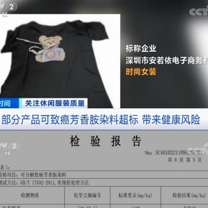 据央视新闻报道,近期,国家市场监督管理总局开展抽检,在检测过程中,一件标称为深圳市安若依电子商务有限公司生产的时尚女装,被检出一种名为“联苯胺”的可致癌芳香胺染料超标,而且超标非常严重。检测工程师表示,该产品的可致癌芳香胺染料实测高达540毫克每千克,超标27倍,这意味着致癌染料具有较高浓度,对人体健康带来的安全风险也更高。