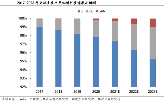 目前Si仍是半导体材料主流,占比95%。Yole预测,第三代半导体渗透率将逐年上升,SiC渗透率在2023年有望达到3.75%,GaN渗透率在2023年达到1.0%。
