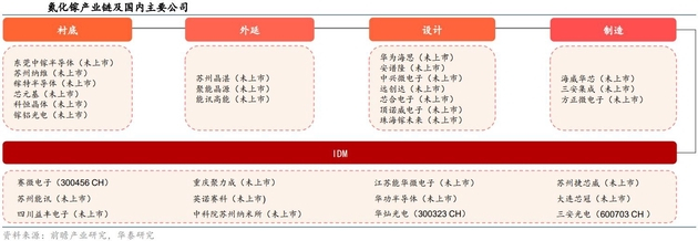 国内GaN产业链也在加速布局中。国内企业在衬底、外延、设计、制造等领域均已布局,包括GaN衬底制造商苏州纳维、东莞中镓;外延制造商晶湛半导体、江苏能华;设计企业安谱隆、海思半导体;制造企业三安集成、海威华芯等。