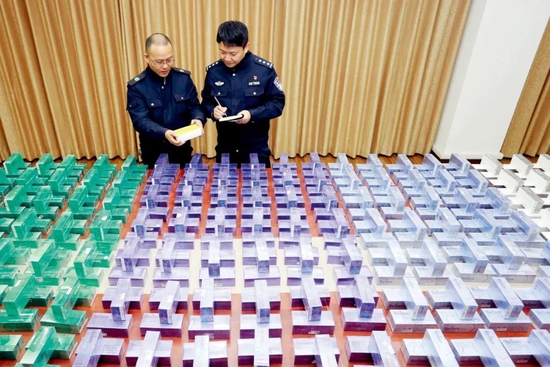 2020年12月22日,浙江舟山市岱山县公安局民警与岱山县烟草专卖局工作人员清点查获的非法经营电子烟烟弹。图/中新