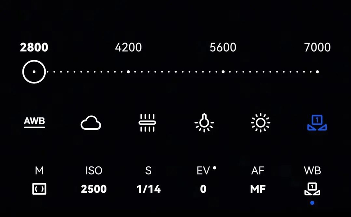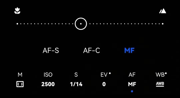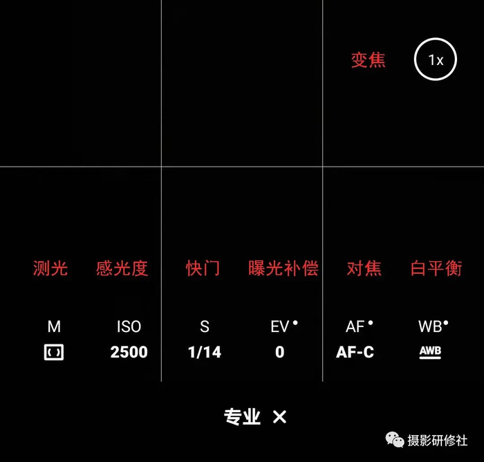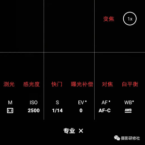 打开手机相机中的专业模式后,映入眼帘的是这个界面,里面有很多选项可以调节。