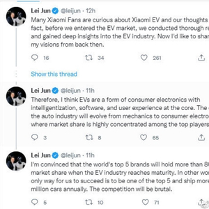 据中新经纬,20日,小米创始人雷军在Twitter上发文分享了对电动汽车行业的一些看法。雷军表示,汽车行业的本质将从机械演变为消费电子,市场份额高度集中于顶级玩家手中。雷军还表示,他相信,当电动汽车行业成熟时,世界前五大品牌将占据80%以上的市场份额。他称:“换句话说,我们成功的唯一途径是成为前五名之一,并且每年出货量超过1000万辆。竞争将是残酷的。”