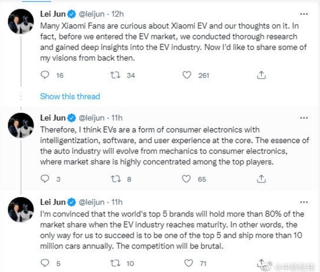 雷军多次通过社交媒体谈及小米造车。9月8日,雷军就在推特上回应了“小米错过新能源汽车市场窗口期”的说法,表示特斯拉比小米提前10多年进入电动汽车行业,但在他看来,“比赛才刚刚开始,我认为小米有很多机会”。