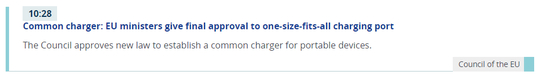 10月初,欧洲议会通过一项法案 :自2024年起部分消费电子产品必须提供单一的USB-C充电接口。