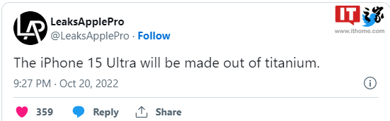 LeaksApplePro 表示,苹果将为 iPhone 15 Ultra 提供粉丝们梦寐以求的钛合金外壳。此前苹果已在 iPhone 手机中采用不锈钢。