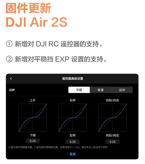 IT之家了解到,大疆 DJI RC 遥控器此前并不支持 DJI Air 2S 无人机,因此 DJI Air 2S 无人机进行了固件更新,包括对 DJI RC 遥控器、平稳档 EXP 设置的支持。