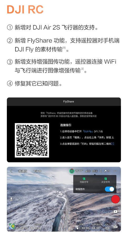 新增支持增强图传功能,遥控器连接 WiFi 与飞行端进行图像增强传输。