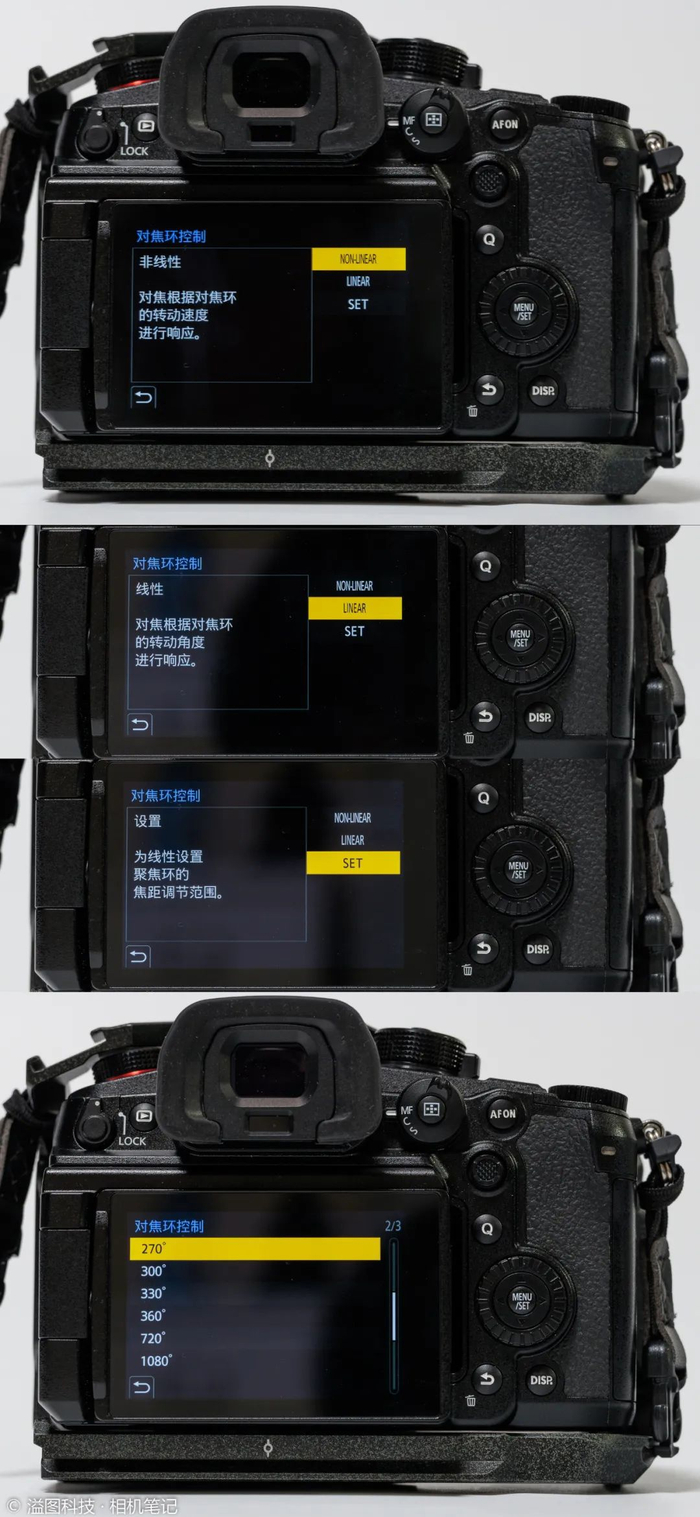松下微单(以 GH6 为例)搭配兼容镜头时,可以在菜单“对焦环控制”选项中设置非线性或线性对焦。选择线性对焦时,还可以自定义对焦行程(从 90° 到超过 1080°)。