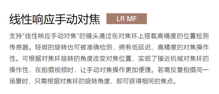 电子对焦环不仅可以简化镜头设计,有助于小型化与轻量化。还可以让让对焦环的使用方式变得更灵活。例如,根据自己的操作习惯设置转动方向、联动方式等 —— 比如非线性对焦就是根据转动速度来控制焦点移动,慢转小幅移动、快转大幅移动。