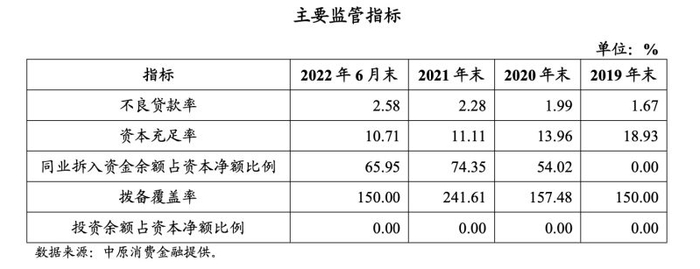 但其他监管指标显示,2019年至2022年上半年,中原消金的不良贷款率分别为1.67%、1.99%、2.28%、2.58%,可以看到公司不良率逐年攀升;资本充足率分别为18.93%、13.96%、11.11%、10.71%,则是逐年下降。