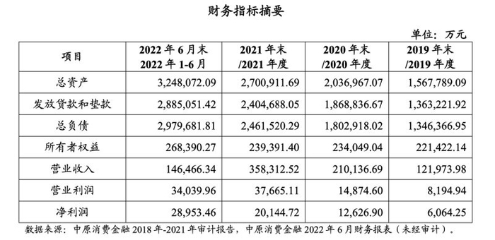 报告披露了近三年中原消金的财务指标。内容显示,2019年末至2022年上半年末,中原消金的总资产分别为:156.78亿元、203.7亿元、270.01亿元、324.81亿元;发放贷款和垫款的数据分别为:136.32亿元、186.88亿元、240.47亿元、288.51亿元;总负债分别为:134.64亿元、180.29亿元、246.15亿元、297.97亿元;净资产分别为:22.14亿元、23.41亿元、23.86亿元、26.84亿元。