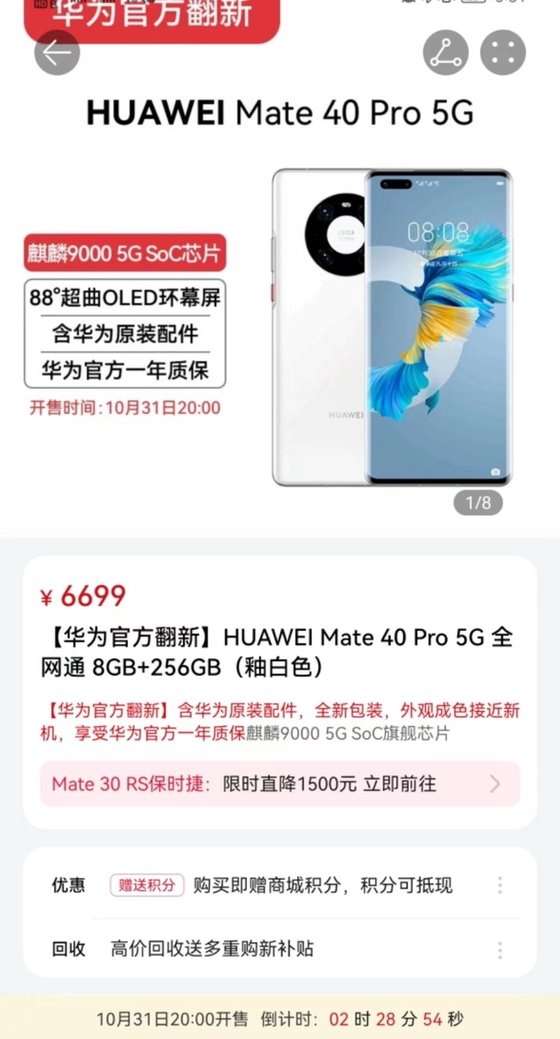 10月31日,华为商城正式上架官方翻新机。首款机型为Mate 40 Pro 5G,提供的是全网通8GB+256GB(釉白色)版本,将于今晚8点开售。据悉,该款手机上架时是6999元,此次官翻机售价为6699元,便宜了300元。