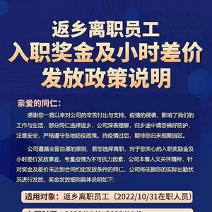 11月1日晚,富士康iDPBG人力资源管理总处在富士康“爱口袋”APP公布了返乡离职员工入职奖金(俗称“返费”)及小时差价发放政策说明。该说明对返乡离职员工的辛苦付出与支持表示感谢,指出疫情影响了工作与生活,公司对部分员工选择返乡深表理解,提醒返乡人员途中做好防护,注意安全,严格遵守各地防疫政策,待疫情过后,期待归来相聚园区。