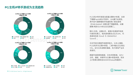 PC/主机IP转手游是当前最主要的IP来源,全球下载量Top100的IP手游中,33%属于此类型。其中由PC端移植到手机端的热门射击游戏《PUBG Mobile》长期位居下载量榜首。动漫剧集/电影以21%的占比位居第二。