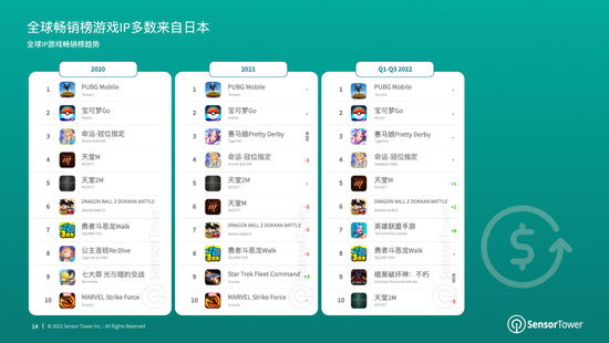 PC/主机游戏转手游的趋势越加明显,2022年入围IP游戏下载榜Top20的游戏中,PC/主机IP高达14款,较2020年多出2款。《PUBG Mobile》、《植物大战僵尸》均为典型代表;而在2022年5月发行便成功闯入2022年前3季度下载榜前十的《Apex Legends Mobile》,更加印证该类IP的强大号召力。