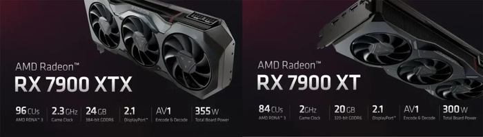 RX 7900 XT 则有 84 个主频为 2Ghz 的计算单元、20GB 的 GDDR6 内存以及稍慢的 320 位总线,功耗为 300W。