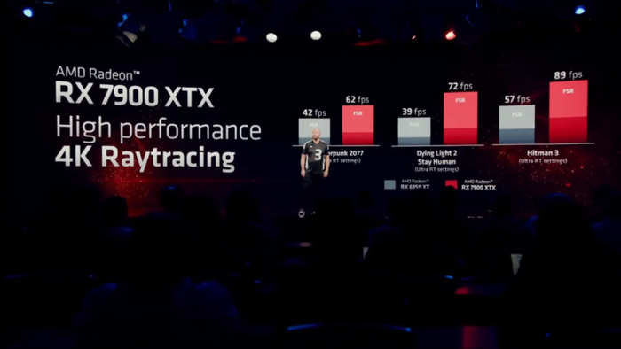 在 4K 游戏中,RX 7900 XTX 在《赛博朋克 2077》的帧数达到 62fps,支持光线追踪和 AMD FidelityFX 超分辨率(FSR)。AMD 表示,新的计算单元中支持下一代光线追踪技术,性能相较上一代显卡实现了 50% 的提升。这一帧数显然弱于带有 DLSS 2 或 DLSS 3 的 RTX 4090 4K 表现,因而更像是 RTX 4080 的竞品。