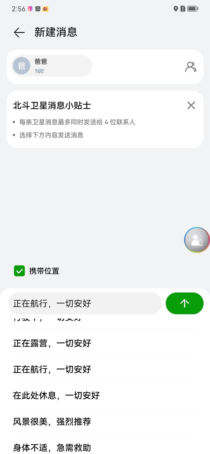 实测,在没有SIM卡和WIFI情况下,可以使用畅联通话。每条卫星消息可以最多同时发给4位联系人。在众测阶段,只能使用自定义的快捷短消息,且系统默认携带位置。