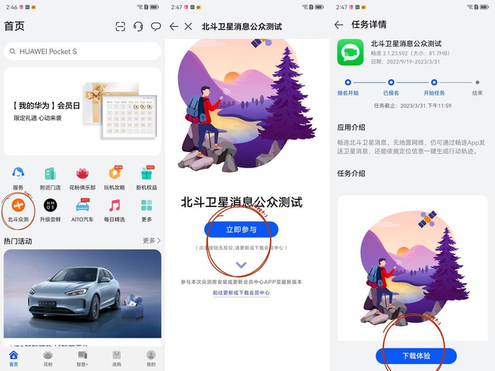 目前支持北斗卫星消息的有华为的Mate 50系列和Mate Xs 2,如何众测北斗卫星功能。记者体验发现,需要在升级到Harmony OS 3的基础上,点击【我的华为】APP-点击“北斗众测”入口-点击报名-通过后点击下载体验。