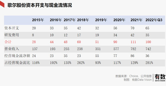从歌尔的现金流状况可以看出,自2018年,接下AirPods订单后,资本开支与研发费用连年暴涨。但与此同时,歌尔股份的经营性现金流常年低于资本开支与研发费用的总额。