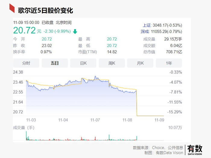 11月9日,果链龙头歌尔股份开盘一字跌停。