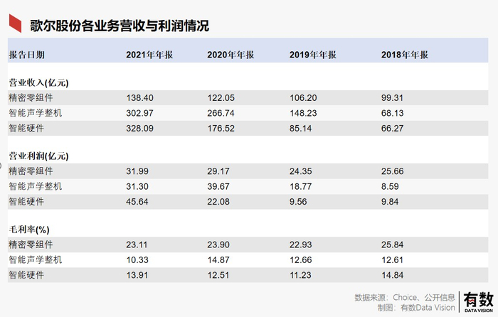 (1)精密零组件,其核心产品为声学零组件。这是歌尔成立后的发家业务,并在2010年前后借此切入苹果,一举实现业绩飞跃。目前是歌尔三大业务中体量最小,营收最稳定,但毛利最高的业务。