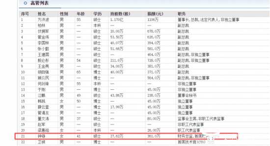 根据东方财富网显示,去年,钟铮的薪酬降至361万,目前持股27.62万。眼下,她兼任起首席财务官,薪资会有什么样的波动,值得期待。