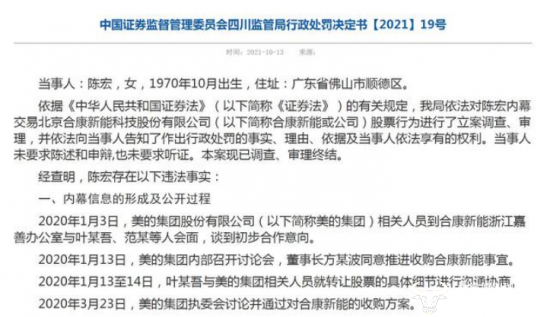半年后,四川证监局网站披露了一则行政处罚决定书。肖明光涉嫌内幕交易,妻子陈宏因内幕交易合康新能,盈利10.57万,被罚80万。