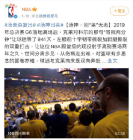 基于“热点+社交”的独特属性,篮球领域重大事件在微博平台得以升温成为全网热点话题。年初NBA球星克莱·汤普森复出就曾在微博掀起一阵讨论,结合超话社区、直播连麦和实况讨论等产品做足热点,颇具谐音梗的话题词#汤神归莱#阅读量累计超过2亿。