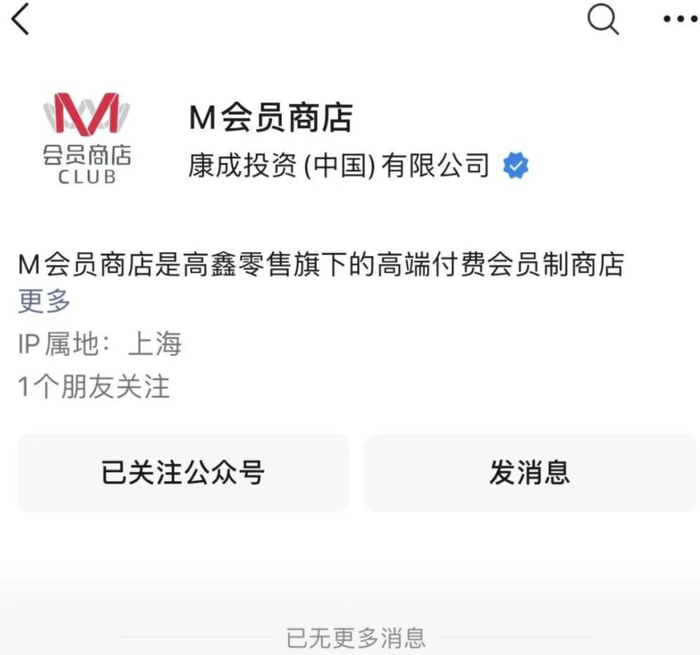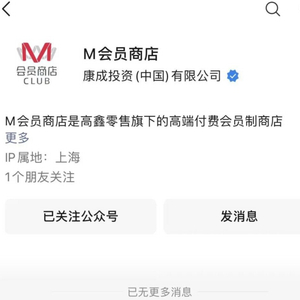 2022年9月22日,以“康成投资(中国)有限公司”为主体的公众号“M会员商店”已经正式注册。而康成投资(中国)有限公司正是大润发品牌的实际运营公司,其母公司为高鑫零售,M会员店则是高鑫零售旗下的高端付费会员店。
