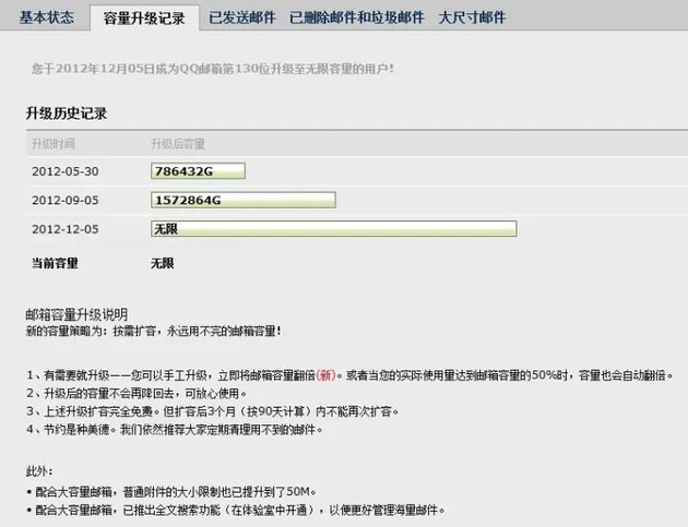 就中国大陆用户来说,QQ邮箱可能是大家日常生活中使用比较多的一款产品,但有很多人都不知道QQ邮箱曾有一个其他几家无法比拟的神奇之处。你可以每90天手动免费扩容一次,扩容后邮箱容量翻倍,而且当你容量用到50%之后也会自动翻倍,直至最终实现类似下图的“无限容量”。