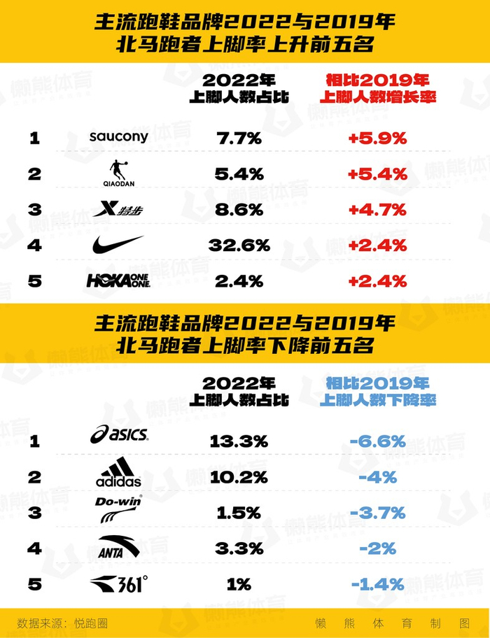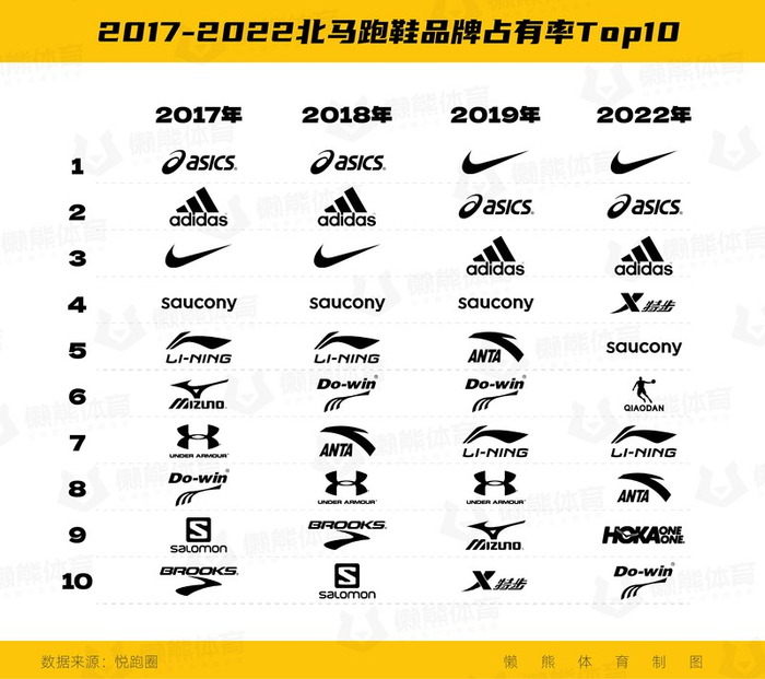 懒熊体育基于悦跑圈报告对2017到2022年四届北马跑鞋品牌占有率等数据,尤其是2019和2022年两届各品牌的数据变化进行了分析。结果发现,跑鞋江湖的格局短短几年已发生沧海桑田的变化。基于数据和业内调研,希望对“谁赢了,谁输了?为什么赢,为什么输?”这些问题进行解读。