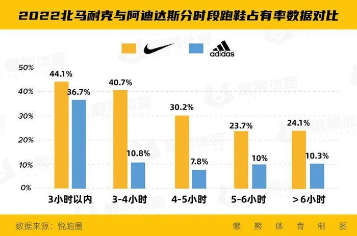 精英跑者方面,在今年北马3小时内完赛的跑者中,选择耐克的跑者最多,占比达到44.1%。可见,在经历新疆棉事件后,起码在北马这个舞台上,耐克的产品力和品牌力并未褪色。